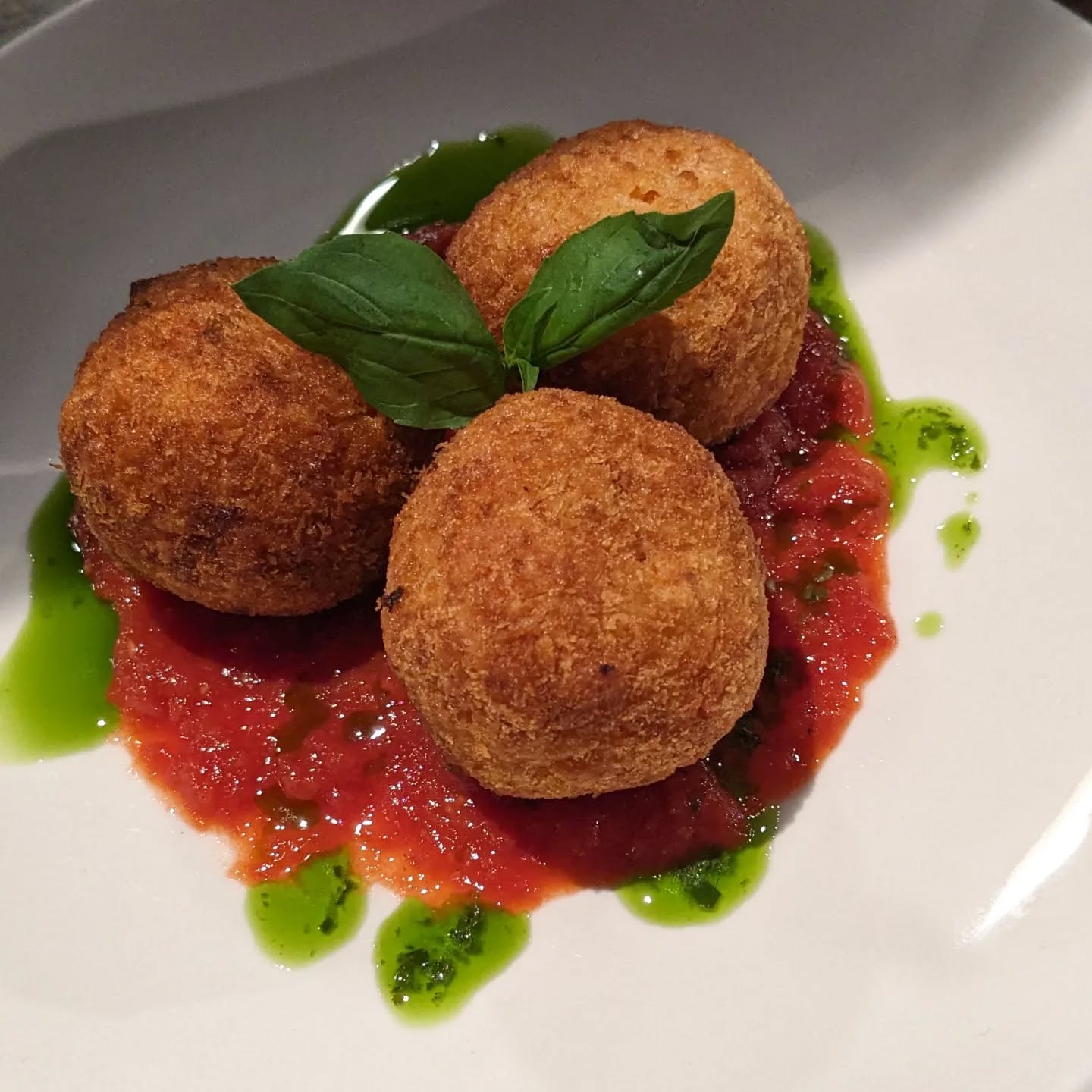 アランチーニ(ライスコロッケ) トマトライスで、モ…